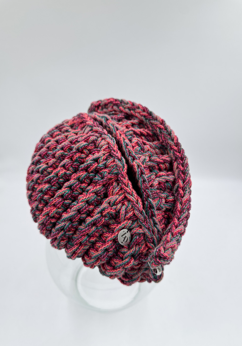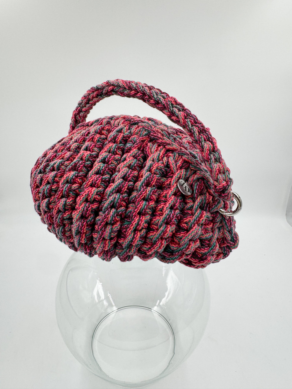 Kézzel horgolt, egyedi, naplemente idézte, kagyló alakú táska, amely különleges formájával igazán figyelemfelkeltő. Praktikus méretével ideális a mindennapokra, miközben stílusos és játékos kiegészítője lehet bármely öltözetnek.